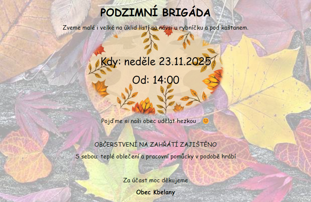Zveme všechny, malé i velké, na podzimní brigádu, která proběhne v neděli 23. listopadu 2025 od 14:00. Akce se uskuteční kolem rybníčku a pod kaštanem, kde budeme uklízet listí. Všichni jsou vítáni, ať už s rodinou nebo přáteli. Na místě bude zajištěno občerstvení na zahřátí, takže si můžete užít př